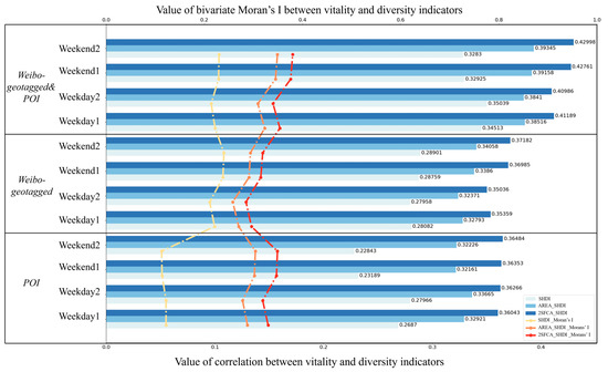 In this study, the Pearson correlation coefficient was initially employed to investigate the correlation between TAZ vitality and the three diversity indicators (SHDI, AREA_SHDI, and 2SFCA_SHDI) derived from both POI and Weibo-geo-tagged data. Additionally, the bivariate Moran’s I [59] was utilized to examine the spatial correlation degree and formulated in the following equation: