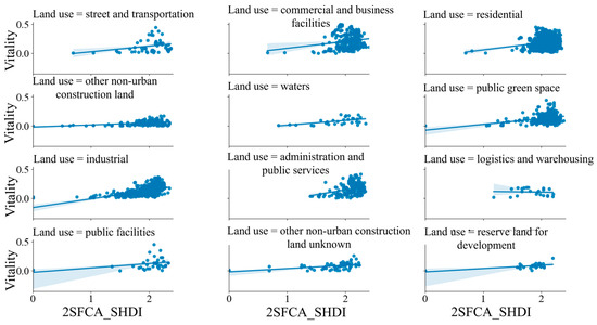 Regression of vitality and 2SFCA_SHDI (POI and Weibo-geo-tagged combined) under different land-use types.