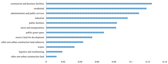 Here, we further analyze how the proposed “perceived diversity” contributes to urban vitality under different land-use types (Figure 10). Specifically, the accessibility-based diversity indicator (2SFCA_SHDI) measured from the combination of geo-tagged photos and POI data was used. Figure 10 underscores varied contributions of diversity to vitality across different land-use categories. Together with Figure 11, the diversity of TAZs in Shenzhen dominated by “commercial and business facilities”, “residential”, and “administration and public services” presented the major contributions to vitality (with coefficients of regression are as high as 0.125, 0.118, and 0.11, respectively). For TAZs dominated by commercial and business facilities, enhanced diversity seems to be able to boost the vitality of Shenzhen’s neighborhoods. In contrast, for non-urban construction land, logistics and warehousing, and water-dominated TAZs, the contribution of diversity to vitality is marginal (the coefficients are as low as 0.033, 0.019, and 0.013, respectively). This implies that improving diversity within these areas does not significantly impact the vibrancy of the neighborhoods.