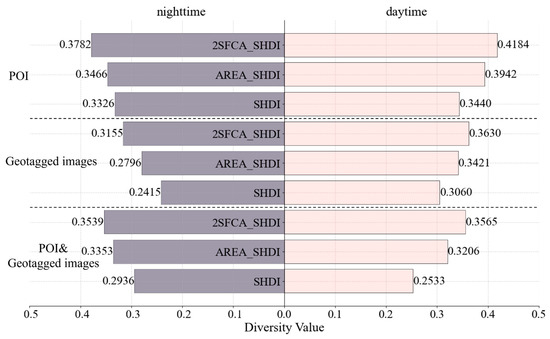 To get insight into how the correlation between vitality and diversity varies during a day, we split daytime and nighttime using 8 am and 8 pm as splitting points [64]. First, Figure 13 generally confirms our previous findings. That is, the use of combined data sources improved the correlation irrespective of time. The proposed area- and accessibility-based diversity indicators performed better. Though human activity (vitality) is much lower at night (Figure 12), the correlation between diversity and vitality at night was only a little lower than during the day.