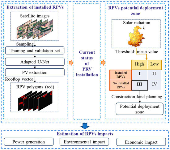 The proposed framework for RPVs’ extraction and potential analysis is presented in Figure 1. It consists of three main components: (1) extracting the spatial location and size of installed RPVs from remote sensing images based on the adapted U-Net semantic segmentation model and rooftop vector data; (2) further finding the potential deployment zone considering solar radiation and construction land planning; and (3) estimating the power generation, and the environmental and economic impact of RPVs.