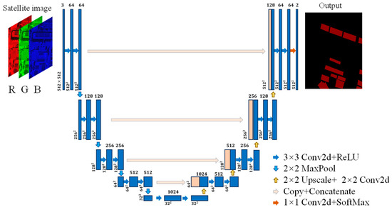 With the emergence of high-resolution remote sensing images, a variety of machine learning techniques have been employed to extract geospatial and detailed information about installed RPVs from these images. Conventional machine learning algorithms, such as RF classifiers and Support Vector Machines (SVMs), have often been used for RPV classification relying on feature extraction [26,27]. With the rapid development of deep learning, more advanced semantic segmentation models utilizing convolutional neural networks (CNNs) have been adopted to extract RPVs owing to their superior ability to learn image features compared to conventional machine learning algorithms [28,29]. A well-known semantic segmentation model is U-Net, which was originally introduced in 2015 to address medical image segmentation challenges [30]. This model can enhance segmentation performance by combining low-level and high-level features through skip connections, and achieve high-accuracy results with relatively small datasets and shorter training times. Therefore, we utilized the U-Net network as the basic model to extract installed RPVs. By adjusting the basic model’s parameter and integrating building vector data, we identified RPVs from remote sensing images as outlined below: