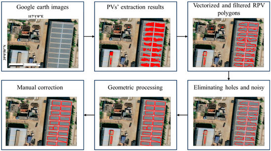 The adapted U-Net model produced a pixel-level classification output of all PVs, presented in raster format for the Tianjin region. Since the objective was to extract the location and area of RPVs, the results required further transformation and processing, as illustrated in Figure 3. First, PV pixels were converted into vector polygons to facilitate the attainment of more details [34]. Based on building vector data, we then filtered the PV polygons outside the building rooftop boundary to obtain RPV polygons. Next, ArcPy geoprocessing tools were used to eliminate internal holes and noise in the RPV polygons, with a noise threshold of 1.6 m2, which is the typical size of an individual solar panel [35]. Given that RPV panels are typically rectangular, GIS geometric processing tools were applied to regularize the shape of RPV polygons. Finally, incorrect RPV polygons were manually corrected by visual interpretation and field surveys.