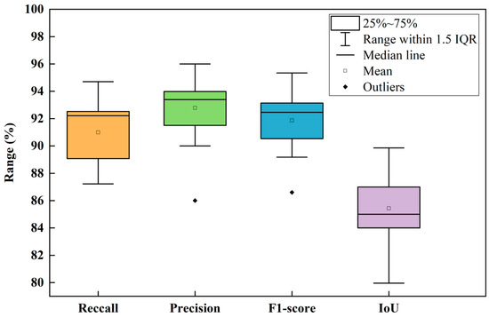 To evaluate the accuracy of the revised U-Net model in detecting RPVs, four key metrics were employed, including Precision, Recall, F1-score, and IoU. Specifically, Precision is the ratio of true-positive predictions to the total number of positive predictions made by the model, which reflects the accuracy of the model in predicting the positive class (Equation (2)). Recall is the ratio of true-positive predictions to the total number of actual positive samples (Equation (3)). It indicates the model’s ability to detect all the positive samples. Additionally, the F1-score is the harmonic mean of Precision and Recall, providing a single score that balances both metrics (Equation (4)). A high F1-score indicates that the model has a good balance between Precision and Recall. Finally, IoU is a metric used to measure the overlap between the predicted bounding box and the actual bounding box, commonly applied in object detection and image segmentation tasks (Equation (5)). It is calculated as the ratio of the intersection area to the union area of the predicted and actual regions.