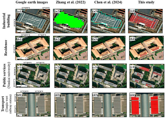 To further assess the accuracy of the adapted U-Net model, its extracted RPV data were compared with two publicly available PV datasets from other studies [29,44], as illustrated in Figure 5. Several representative sites were selected, considering different building functions. The results indicate that the RPVs extracted by the adapted U-Net model are closer to the real PV panels (a1–a4), as more detailed information was captured. Moreover, small-scale PVs on buildings such as residential and public service buildings were also accurately identified (b4 and c4), whereas these PVs were not detected in the studies by Zhang et al. (2022) and Chen et al. (2024) (b2–b3 and c2–c3). This discrepancy can primarily be attributed to the latter studies’ focus on detecting large-scale centralized PV systems. Notably, large-scale PV systems, such as the system deployed on the canopy of the Tianjin west railway station, were not detected by the two studies (d2–d3), possibly due to interference from reflective surfaces of adjacent glass. By contrast, the adapted U-Net model effectively identified these PV systems. Overall, the adapted U-Net shows higher accuracy in identifying RPVs, particularly in detecting small-scale and easily confused RPVs.