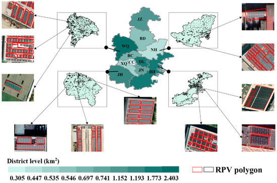 Installed RPV distribution at district and polygon level. The abbreviations of 11 districts in Tianjin are XQ, Xiqing; DL, Dongli; CC, Central city; BC, Beichen; JN, Jinnan; BD, Baodi; WQ, Wuqing; BH, Binhai New Area; NH, Ninghe; JH, Jinghai; JZ, Jizhou.