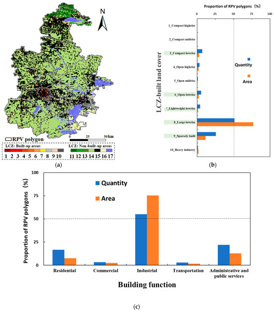 Spatial distribution of RPV polygons. In order, 11–17 represent heavy industry, dense trees, scattered trees, bush, scrub, low plants, bare rock or paved, bare soil or sand, and water. (a) Overlay of RPV polygons and local climate zones (LCZ); (b) Variation in RPV polygons in different LCZ building types; (c) Variation in RPV polygons in different building functions.