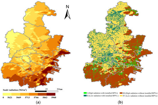 Based on the spatial distribution of installed RPVs, the future potential zones for RPV deployment in Tianjin were further determined by considering critical factors such as solar radiation and land spatial development planning. Solar radiation significantly influences the effectiveness of PV systems, as higher solar radiation levels mean more energy output for the same capital input [47]. As shown in Figure 8a, the annual solar radiation in Tianjin generally decreases from east to west. Using the average annual solar radiation as a threshold, Tianjin was classed into high and low solar radiation zones. By overlaying this radiation classification with the presence or absence of installed RPVs, Tianjin was further divided into four specific zones (Figure 8b). The results reveal that only 30% of installed RPVs are located in the high-solar-radiation zone (Zone I), while the majority are situated in the low-solar-radiation zone (Zone II), indicating that many RPV systems are not operating at optimal generation. This distribution pattern is largely influenced by building spatial locations, with approximately 69% of Tianjin’s buildings situated in low-solar-radiation zones.