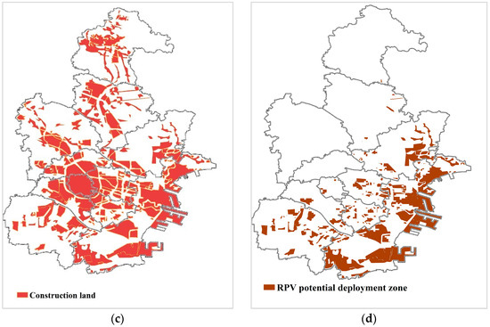 Based on above consideration, the high-solar-radiation zone without installed RPVs (Zone III) is the preferred zone for future RPV deployment. It is worth noting that urban building design and planning in China adhere to uniform national standard [8]. Therefore, when assessing the RPV potential in China, it is crucial to consider government-led construction land planning as this will determine the future installation spaces for RPVs. In this study, based on the 2021–2035 construction land use planning for Tianjin [22] (Figure 8c), a potential deployment zone of RPVs for the next decade was identified by extracting the overlapping region of construction land and Zone III (Figure 8d). The potential deployment zone is primarily located in the southeast of Tianjin, encompassing districts such as BH, JH and NH, and covering approximately 13% of the municipal land area.