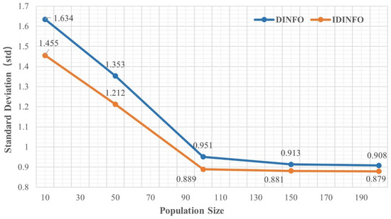 Similarly, Table 2 and Figure 3 illustrate the effect of different iteration counts (100–2000) on optimization performance when the population size is fixed at 100. The results indicate that with fewer iterations (e.g., 100 and 500), the optimization performance is poor, and the standard deviation is high (DINFO: 1.844 and 1.379; IDINFO: 1.532 and 1.221), showing that the algorithm has not yet converged. As the number of iterations increases, the optimization results improve, and the standard deviation gradually decreases. When the iteration count reaches 1000 or more, the standard deviations for DINFO and IDINFO stabilize at 0.958 and 0.832, respectively, indicating convergence.