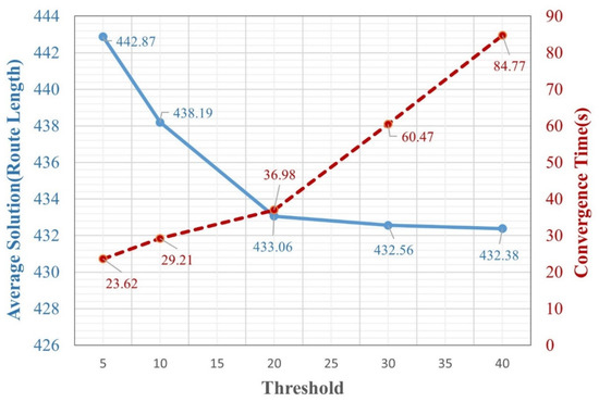 To confirm the threshold properly, we adjust its value and analyze IDINFO’s optimization effectiveness and convergence time. In the tests, both 2-opt and 3-opt share the same threshold setting. In this testing, thresholds of the 2-opt and 3-opt local search algorithms are set the same. We summarize the average results from 10 runs to evaluate the effect of the threshold on the average route length (Average Solution) and convergence time (Convergence Time), as shown in Figure 4. The blue line represents the Average Solution, while the red line represents the Convergence Time. From Figure 4, it is observed that as the threshold increases, the route length gradually improves and reaches 433.06 at a threshold of 20, indicating that increasing the threshold enhances search quality. However, when the threshold further increases to 30 and 40, the improvement becomes negligible (432.56 and 432.38, respectively), suggesting that an excessively high threshold does not significantly enhance performance. On the other hand, the convergence time increases significantly with a higher threshold. It grows from 23.62 s at a threshold of 5 to 29.21 s, 36.98 s, 60.47 s, and 84.77 s at thresholds of 10, 20, 30, and 40, respectively. Particularly, when the threshold exceeds 20, the computational cost rises sharply while the optimization gain saturates.