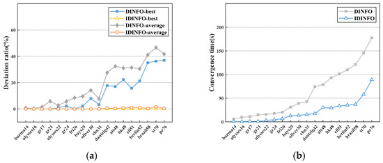 Testing results of DINFO and IDINFO using TSP instances: (a) the deviation ratio of solutions on the TSP instances, (b) convergence time on the TSP instances.