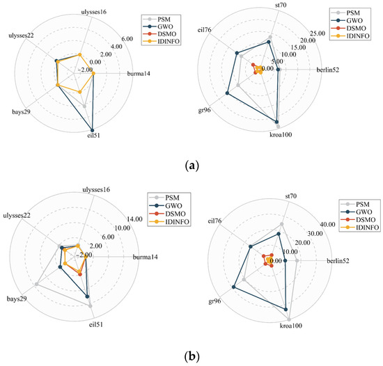 Based on the findings presented in Table 7, it can be observed that the PSM algorithm performs poorly on 5 and 9 out of 10 instances, respectively, and has the worst overall performance among all algorithms. GWO algorithm performs similarly to PSM in terms of the best solution index. It achieves the best on only two small instances and performs poorly on five instances. However, it performs better than PSM in terms of the average solution, only performing poorly on the gr96 problem. As a new method, the DSMO algorithm performs well and competes fiercely with the proposed IDINFO algorithm. In terms of the best solution, the two algorithms, i.e., DSMO and IDINFO, perform best on eight and nine instances, respectively. But the best solution of IDINFO on kroa100 is slightly worse than DSMO by 2%. Meanwhile, DSMO is 2% and 9% worse than IDINFO on eil76 and gr96, respectively. This indicates that the gap between the two algorithms is small, yet our proposed IDINFO algorithm shines forth with superiority. On the other hand, the average solution of IDINFO in all instances is best, which is far superior to the DSMO algorithm. Among them, DSMO has only a little advantage in three instances (see Table 6). For the selected 10 instances, the average solution Avg of IDINFO is 4059.59, which is lower than the average values of the above three algorithms, 5174.32, 4858.30, and 4115.50. Additionally, when comparing the average best solutions of all instances, IDINFO shows a lower Avg (4032.44), second only to DSMO, with a difference of 1%.