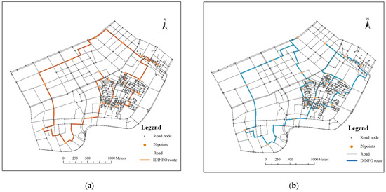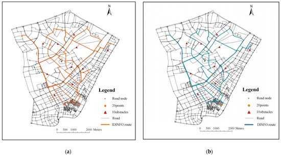 This application of the IDINFO algorithm indicates that it can be successfully applied in real space to quickly and effectively find the optimal route for the TSP. The experimental results show that IDINFO can not only significantly optimize path planning in standard short-distance distribution tasks but also maintain high solution efficiency and path quality in road environments interfered by obstacles, further proving its practicability in urban logistics, intelligent scheduling and other geoinformatics practical applications.