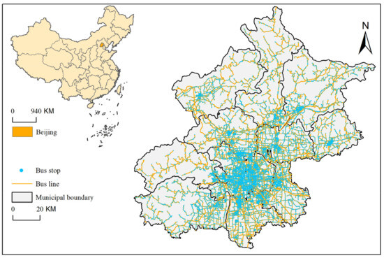 Beijing, one of the world’s largest cities, is located on the North China Plain in eastern China, with a total area of approximately 16,410 square kilometers [41]. The city consists of 16 county-level administrative divisions aligned longitudinally and 327 streets of varying sizes [42]. According to the Seventh National Census, Beijing’s permanent population reached 21.893 million, a net increase of 2.281 million over the decade since the Sixth Census in 2010 [43]. As an ancient capital of China, Beijing has a rich history and profound cultural heritage. Throughout its history, Beijing has served multiple times as the political and cultural center of China, witnessing the rise and fall of several dynasties [44]. The development and evolution of Beijing’s bus network have paralleled these historical changes. Over a long historical evolution, Beijing’s public transportation system has developed into a distinctive, mature, and complex network [45]. Drawing on both domestic and international advanced practices, it continuously adopts innovative technologies to enhance the quality and efficiency of transit services, making Beijing’s transit system a model for urban transportation networks worldwide [46]. Given the complexity and maturity of its transit network, dense population, and intricate urban structure, Beijing was chosen as the study area, as shown in Figure 1.
