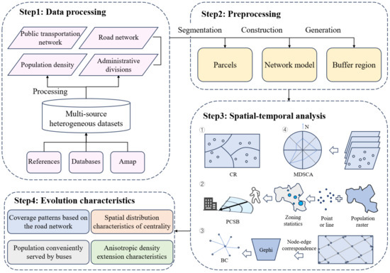 This study aims to analyze the spatial-temporal evolution of Beijing’s transit network through data from multiple years, including transportation networks, road networks, and population data. Figure 2 illustrates the specific methodological workflow of this work. Given the heterogeneous forms of data sources, GIS software was employed for data preprocessing tasks such as coordinate calibration and range clipping to ensure data consistency. First, block units were segmented using road networks of different levels in conjunction with Beijing’s administrative division data and overlay analysis was performed by intersecting segmented block units with transit stops to obtain coverage statistics within different spatial areas, illustrating the overall evolutionary trends. Second, a transit stop service radius of 500 m was established to create service area polygons for each stop. These were then combined with the population grid data, and spatial analysis tools were used to calculate the population proportion of convenient public transport services for each administrative district and ring road in different years, and the visualization charts were displayed [50]. Then, based on the bus network data, a complex network model was established to identify the corresponding relationships between nodes and edges in the route network, and Gephi was used to calculate the betweenness centrality of nodes and corresponding edges. Lastly, multi-distance spatial cluster analysis tools were applied to reveal anisotropic patterns in transit network density over time. From a spatiotemporal perspective, this study aims to reveal the spatiotemporal evolution of Beijing’s bus network, through the coverage rate, density extension, and equity.