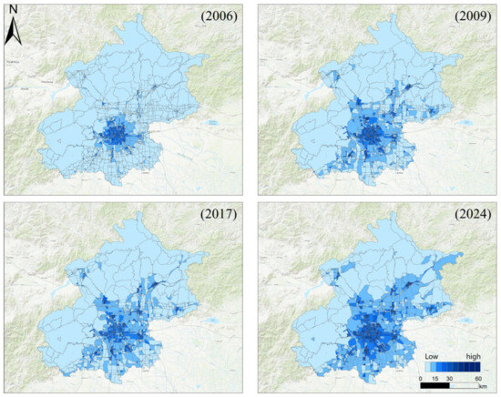 After years of urbanization, Beijing’s bus network has become a uniquely complex network system, making it a typical case of rapid transportation network development. Although previous studies have delved into various aspects of Beijing’s bus network, such as node characteristics, topological properties, and urban demand, which focus on its overall static structural features [46,59], this study further combines dynamic multi-period and multi-source data to explore the spatiotemporal evolution characteristics of Beijing’s bus network from a spatiotemporal perspective. By analyzing data from 2006 to 2024, we found a clear clustering tendency of the bus network in central urban areas (Figure 3), while peripheral urban areas have shown improvement in recent years. However, compared to the central area, a significant disparity remains in the overall service level, and the network coverage and service levels across various peripheral regions are greatly different (Figure 5), particularly in areas like Tongzhou and Yanqing, which are influenced by key events.