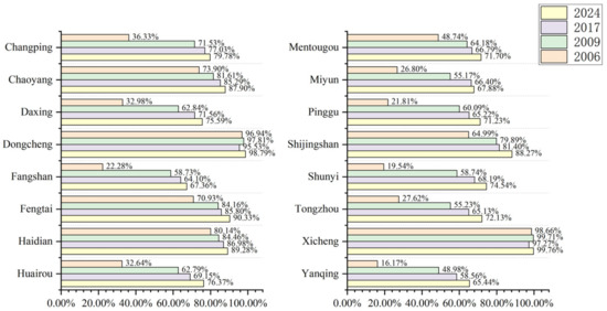 According to the calculated proportions of PCSB in various regions (as shown in Figure 4 and Figure 5), there has been a significant increase from 2006 to 2024 in the proportions of PCSB across Beijing. Notably, areas with high population density, high bus network density, and high public transportation accessibility overlap significantly, indicating that the development of the bus network effectively serves the city’s high-density population areas. Taking Shunyi District as an example, the number of PCSB was 239,850 in 2006, which only provided convenient transport for 19.54% of the district’s residents. By 2024, this number rose to 915,220, with the proportion significantly increasing to 74.54%. The expansion of the bus network and the improvement in infrastructure greatly enhanced bus convenience in Shunyi District. This trend is also prominent in other districts such as Yanqing, Pinggu, and Fangshan, where bus convenience gradually improved, and population accessibility steadily increased. This growth can be attributed to ongoing improvements in transportation infrastructure, the expansion of bus networks, and the continued development of urban fringe areas. In core areas such as Dongcheng and Xicheng, changes in the proportion of PCSB have been relatively small. In Dongcheng, for example, the proportion was 96.94% in 2006, rising slightly to 98.79% by 2024. These core areas already had a very high coverage rate for bus early on, limiting the potential for further increases. Therefore, the further optimization of bus in core areas mainly focuses on improving service quality rather than expanding coverage.