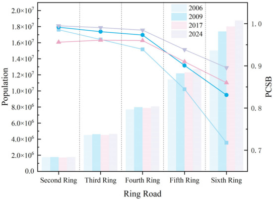 Overall, the number and proportion of PCSB are negatively correlated. This is because, as the ring roads expand, the number of bus stops and routes within their coverage increases, which in turn serves a larger population and contributes to the PCSB count. However, the total population within the area also increases, and since the overall population is much larger than the PCSB count, the two factors are negatively correlated. The development of bus networks in Beijing’s central urban areas and far suburban districts has improved. By 2024, the bus network has gradually expanded to the Sixth Ring Road, significantly enhancing bus convenience in the Sixth Ring and surrounding areas. This also reduced the gap slightly with the central urban areas and improved the travel quality for residents in these regions. This reflects Beijing’s efforts to optimize transportation services in the outer districts through policy support and infrastructure development while expanding the city’s boundaries. The number of bus routes, the density of bus stops, and the connections between the far suburban districts and the core urban areas have significantly improved, leading to notable enhancements in bus convenience and accessibility. Although the overall bus network in Beijing has developed positively, and the PCSB ratio in peripheral areas has gradually increased, there remains a certain gap between the far suburban districts and the core urban areas. The PCSB proportion in several far suburban districts is still around 60% (e.g., in districts like Miyun and Fangshan), while the core urban areas maintain a high ratio of over 90%. This uneven development somewhat limits the balanced growth of the city, impacting the quality of life and economic development potential in the far suburban districts. Given the noticeable spatial gradient in the distribution of bus networks and public service accessibility, further investment in transportation infrastructure is needed in the far suburbs to narrow the gap in transportation convenience with the city center.