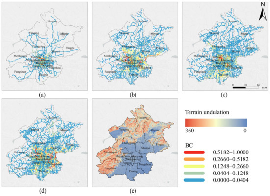 Betweenness centrality and Terrain Relief in Beijing (a) BC in 2006; (b) BC in 2009; (c) BC in 2017; (d) BC in 2024; (e) Terrain Relief.