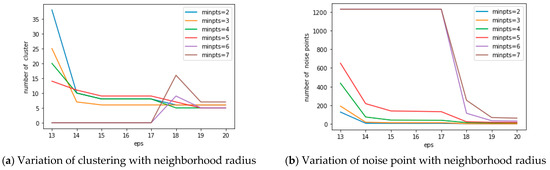 The precision of the terrain data in this experiment is 12.5 m. Using the calculation formula of the neighborhood range, the Eps range for the experiment should fall within [13,20]. Figure 3 illustrates the fluctuation in the number of clusters and noise data as the neighborhood radius varies when MinPts lies between 2 and 7.