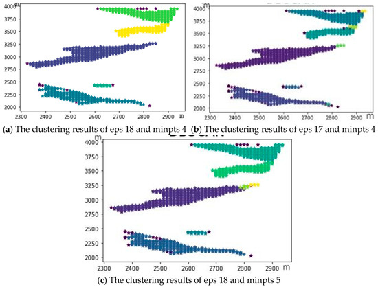 Consequently, clustering was executed with a minimum sample point count of 4 and a neighborhood radius of 18 m, yielding the results depicted in Figure 4.