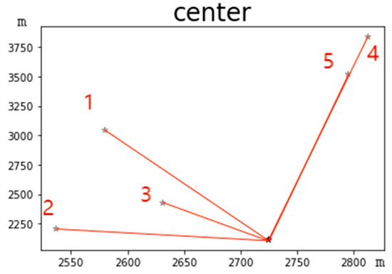 Constructing the spatial semantic relationship between viewsheds and viewpoints reveals that viewsheds are distributed in multiple viewing directions from the observation point. The direction and distance of each viewshed from the viewpoint can be determined by calculating the azimuth attributes of the viewsheds. The divided viewsheds are labeled in Figure 5 in the order of Table 1 viewshed numbers; the gray mark indicates the center point of each viewshed, and the black mark indicates the observer point position. The abscissa and ordinate represent the relative distance between viewsheds, starting from the origin position, considering the terrain accuracy, measured in meters. As can be seen from Figure 5, the viewshed is basically on one side of the observer. When the observer looks around, more viewsheds can be seen on the north side, with no visible areas in the opposite direction.