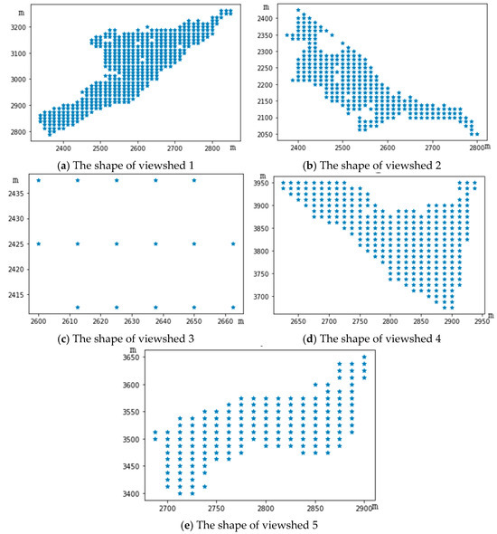 - Shape: The spatial geometry formed by the visible terrain units of a viewshed, which can be represented by the boundary contours distributed by the visible point grid. Then connecting the points adjacent to the outer boundary of each viewshed can obtain the shape of the viewshed. We can judge the sparsity of viewpoint distribution by the shape of viewshed.