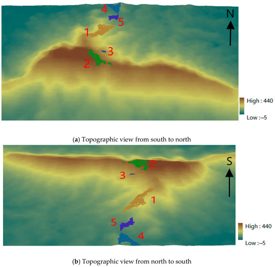Observing from two different positions north and south of Purple Mountain, the three-dimensional display of the viewshed division results is shown in Figure 7. Figure 7a is a view of the south side of the Purple Mountain, and Figure 7b is a view of the north side of the Purple Mountain. Viewshed 1 has the largest number and scale of visible points, but they are linearly distributed and not sufficiently concentrated. Viewshed 3 has the smallest scale, but the distribution of visible points is highly concentrated and matrix-like. Viewshed 2 is distributed in high-altitude areas near the ridge line, and this viewshed has a wide range of visible points. Viewshed 3 is located on the hillside, also a high-altitude area, but its altitude is lower than that of viewshed 2 and higher than that of viewshed 1, 4, and 5. Viewshed 4 has the lowest altitude and is close to the foot of the mountain. Overall, viewshed 1, 4, and 5 have relatively low altitudes and relatively flat terrain.