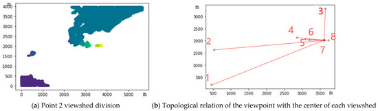 Cluster analysis is performed on the terrain elevation within the range encompassed by the viewshed. Under the proposed methodology, suitable parameters are chosen for clustering. The viewshed is segmented into eight distinct viewsheds, as Figure 9a depicts.