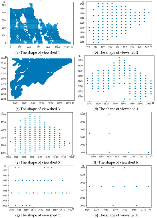 The shape of each viewshed division is shown in Figure 10. The viewshed with the highest number of visible points is viewshed 3, while the one with the least number of visible points is viewshed 6, which has only 6 visible points. This viewshed is at a higher altitude, with an elevation value of 329.334 m. The distribution of visible points is shown in Figure 10f. As can be seen from the figure, the visible points are distributed within a 3 × 4 grid unit, and this viewpoint is near the ridge line of Purple Mountain, where there exists flat land within the viewpoint.