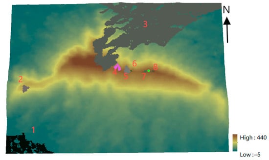 The results reflected from the internal attribute values suggest that the distribution of visible points in viewsheds 7 and 8 is relatively similar. The elevation values of these two viewsheds differ slightly, with the number of visible points in viewshed 7 being approximately three times that of viewshed 8. This is also reflected in the average distance attributes, which are nearly three times as much. Due to the more significant number of visible points in viewshed 7, the sum of central distance is slightly smaller compared with viewshed 8. As can be seen from Figure 10, both viewsheds 7 and 8 show a horizontal stripe distribution.