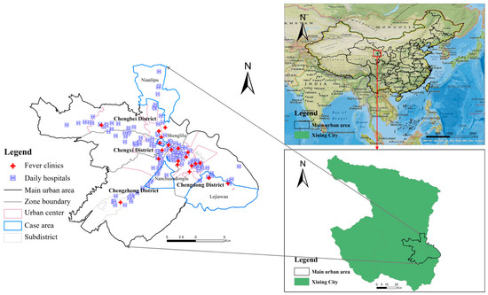 Second, the list of fever clinics was collected from the official website of the Qinghai Province Health Commission https://wsjkw.qinghai.gov.cn/ (accessed on 7 July 2022). In the main urban area of Xining, 22 hospitals have established fever clinics. According to the Qinghai Judicial Administration website https://sft.qinghai.gov.cn/ (accessed on 12 July 2022), the fever clinics are open 24 h a day. We selected community health centers and grade II or above hospitals as normal fever treatment hospitals (referred to as “general hospitals” in this paper). Hospitals with emergency departments at level II and above are generally accessible 24 h a day. Community health centers are usually open from 8:00 to 17:00. A total of 176 general hospitals were identified. Additionally, we acquired basic information about fever clinics and general hospitals, including their grades, number of beds, and addresses, from their official websites. Subsequently, we obtained the geographical locations of the fever clinics and general hospitals from Baidu Map.