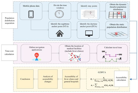 The technical flow (Figure 2) of this paper is as follows: first, mobile phone data were utilized to obtain dynamic and static population distributions. Second, the time cost for residents to reach medical facilities was calculated. Finally, the Gaussian-based two-step floating catchment area method was applied to assess residents’ accessibility to medical facilities for fever, and the results were analyzed.