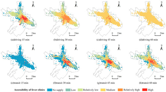 Additionally, the accessibility of fever clinics varied substantially based on different traffic patterns and time thresholds. For instance, within a 15 min drive, the population covered by the relatively low, low, and no-supply accessibility levels was three times larger than that within a 30 min drive. In addition, the population covered by relatively high and above accessibility was 1.6 times larger within a 30 min drive than within a 30 min commute by transit. The measurement of the accessibility of healthcare facilities is sensitive to time thresholds, as we have shown. Pereira (2019) studied the future accessibility impacts of transport policy scenarios. Their study showed that equity assessments of transport projects are influenced by the travel time threshold chosen for the cumulative opportunity accessibility analysis [52]. Consequently, decision-makers must consider these variations to make well-informed decisions and have a clear reference basis.