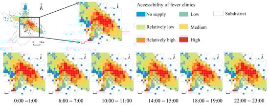To further investigate the dynamic changes in fever clinic accessibility over a 24 h period in the study area, this paper used the 15 min driving scenario as an example to showcase the accessibility pattern (Figure 4). The overall analysis revealed a consistent spatial distribution, with higher accessibility concentrated in the central city and lower accessibility in the periphery. In detail, in the central city, the grids with high accessibility levels almost did not change from 0:00 to 7:00. However, after 7:00, the number of grids with high accessibility gradually declined, reaching a steady state at approximately 10:00. Subsequently, after 18:00, the central city experienced a gradual increase in grids with high accessibility.