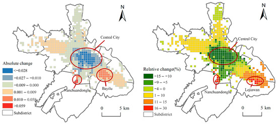 By calculating the mean accessibility values during the day (9:00–18:00) and night (0:00–7:00), we examined the variation in fever clinic accessibility between these two periods (Figure 5). The results showed that the daytime accessibility was generally lower than the nighttime accessibility in the central city, whereas the opposite trend was observed in suburban areas. In specific regions of the central city, such as Lirang, Yinma, Renmin, Shenglilu, and Xinghailu, the accessibility of fever clinics decreased by more than 10% during the day compared to that during the night. Conversely, in parts of Lejiawan and Nanchuandonglu, the accessibility of fever clinics increased by more than 15% during the daytime compared to the nighttime values.