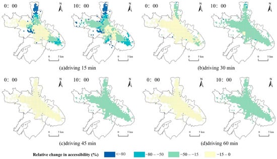 Table 1 and Table 2 show the changes in the accessibility of fever clinics compared to that of general hospitals based on the dynamic population distribution. The accessibility of fever clinics decreased compared with that of general hospitals, indicating that, after the occurrence of major public health events, it was more difficult for residents to seek medical treatment for a fever. In the driving mode, different time thresholds yielded higher decreases in accessibility at 10:00 than at 0:00. In addition, as the travel time cost acceptable to the user increases, the decrease in accessibility decreases, regardless of whether travel is by car or public transportation.