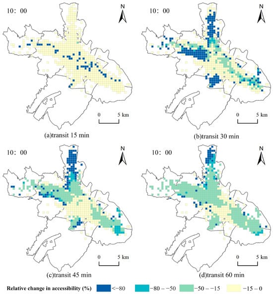 Regarding the driving mode, the accessibility of fever clinics demonstrated a downward trend compared to that of general hospitals. As the travel time cost acceptable to the user increases, the decline in the accessibility of medical care to a resident with a fever decreases. This suggests that, when the temporal threshold is high, it is easy to mask the spatial inequality of accessibility. Specifically, when driving for 15 min, the relative change in fever clinic accessibility compared to general hospitals decreased by more than 80%, with prominent changes observed in Nianlipu and Pengjiazhai (Figure 6a). As the time threshold increased, the decrease in accessibility to medical care for a fever gradually stabilized across the study area. The reductions in accessibility within the study area were all less than 15% when the time threshold was increased to 45 min at 0:00 (Figure 6c). At 10:00, when the time threshold was increased to 30 min, most of the area within the study area experienced less than a 50% reduction in accessibility.