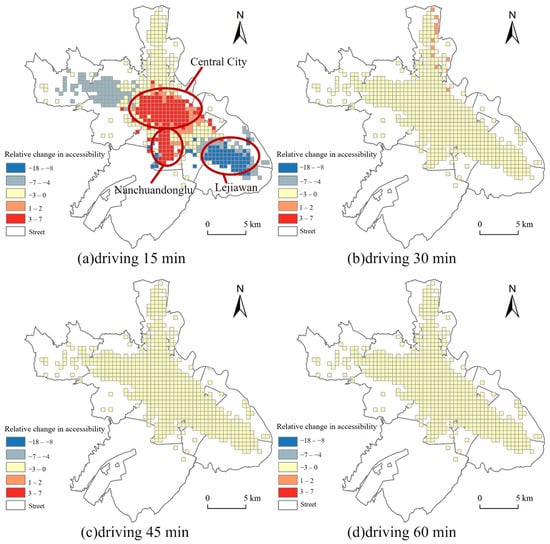 When comparing the NTA with the dynamic population distribution, we observed that the accessibility of the central city and inner suburban areas was overestimated, while the accessibility of the outer suburban areas was underestimated for driving conditions of under 15 min (Figure 8a). Specifically, the accessibility of fever clinics in the central city and Nanchuandonglu was overestimated by more than 3%, while the accessibility of fever clinics in Lejiawan was underestimated by more than 8%. Moreover, as the time threshold increased to 45 min, the accessibility of the entire study area decreased (Figure 8c).