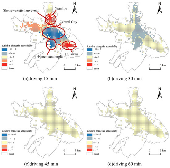 In the public transport mode, the accessibility of fever clinics compared to general hospitals decreased. This suggests that, after the epidemic, the opportunity for residents to access fever medical services via public transportation decreased. When the time threshold was 30 min, the accessibility of residents seeking medical treatment for a fever decreased in central urban areas and decreased even more in suburban areas. Specifically, areas such as Nianlipu, Biotechnology Industrial Park, Pengjiazhai, and Nanchuandonglu Street experienced a reduction in accessibility of more than 80%. Furthermore, as the time threshold increased, the number of areas with significant declines in accessibility decreased. However, even under the 60 min time threshold, the accessibility in Nianlipu still decreased by more than 80%.
