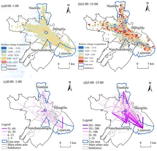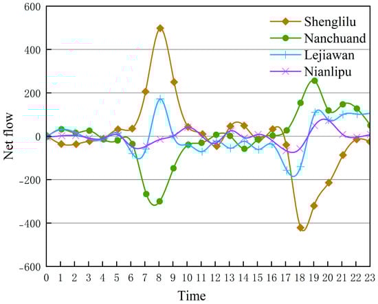 By further exploring the variation in the net mobile traffic for the population in the selected case areas over time, we found that the total number of trips made by the crowd in Shenglilu was significantly greater than that in other case areas, while Nianlipu had the lowest travel intensity. Between 6:00 and 10:00, a large influx of people into Shenglilu was observed, and after 17:00, there was a greater outflow than inflow of people. Many people left Nanchuandonglu between 6:00 and 10:00, but there was an influx after 17:00, indicating a close relationship with residents’ daily commuting patterns (Figure 11).