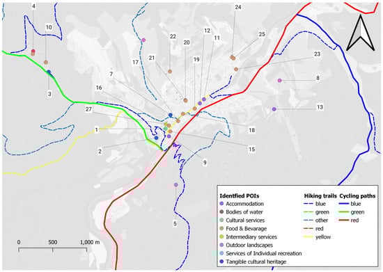 All processed data and cartographic outputs are publicly accessible via the interactive platform https://cases.idoaba.eu/gl/ (accessed on 15 November 2024), a decision-support tool for regional analysis and sustainable development. Based on the information published on this platform, a printed thematic map was subsequently produced to depict the spatial distribution of POIs within Gelnica (Figure 2). This map highlights key components of the tourism offer, with POIs systematically classified into thematic categories, including Accommodation, Bodies of Water, Cultural Services, Food and Beverage, Intermediary Services, Outdoor Landscapes, Recreational Services, Tangible Cultural Heritage, Hiking Trails, and Cycling Paths.