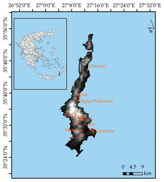 Karpathos (Figure 1) is the second largest island in the Greek Dodecanese group, after Rhodes. Its area is 301.2 km2 with 160 km of coastline, while including the surrounding islets, its area reaches 324.7 km2. At the northern end of the island, there is the islet of Saria, which has an area of 21 km2 and is separated from Karpathos by a strait only 100 m wide [24]. It is located at the southwestern end of the Dodecanese Prefecture, in the middle of the Carpathian Sea, between Rhodes and Crete, and its capital is Pigadia or Karpathos with almost 2700 inhabitants, according to the last census of the Hellenic Statistical Authority [25]. Karpathos consists of the Municipality of Karpathos, which includes the settlements in the southern and central parts of the island, and the Community of Olympus, which includes the northern part and the islets of Saria and Chamili. Together with the island of Kasos, the island of Saria, and other small islets around them, they form the District of Karpathos, one of the four of the Dodecanese [26].
