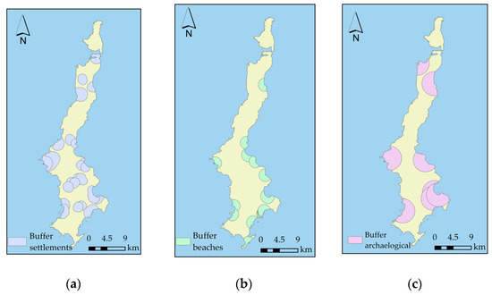 The settlement level has been taken from CORINE Land Cover 2018 [41] by selecting categories of continuous urban development and intermittent urban development. These layers are polygons. For the settlements that are not displayed in this database, the authors have digitized them using the base map from ArcGIS Online World (Esri, HERE, Garmin, OpenStreetMap contributors, and the GIS user community—Source: Esri, DigitalGlobe, GeoEye, Earthstar Geographics, CNES/Airbus DS, USDA, USGS, AeroGRID, IGN, and the GIS User Community). All these settlements, whether taken from CORINE Land Cover 2018 or digitized by the authors, are polygons; however, for visual reasons, they are presented in Figure 4a as points. The list of beaches included in the monitoring program for the quality of bathing water coordinated by the Ministry of Environment, Water, and Tourism has been taken from the Greek Bathing Water Profiles Registry [42] and has been digitized by the authors.
