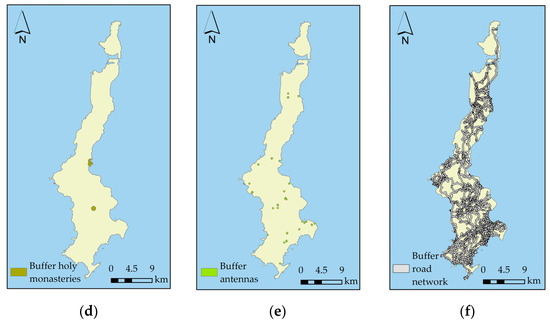 Buffer zones for each constraint: (a) settlements; (b) beaches; (c) archeological sites; (d) holy monasteries; (e) mobile network antennas; and (f) road networks.