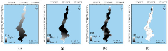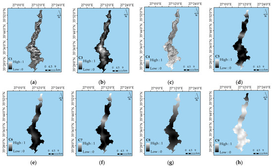 There are no specific distances from specific zones for the siting of PVs. However, according to the legislation, PVs cannot be installed in specific areas, as presented in Table 1. The criteria for this analysis are approximately the same as the analysis for WTs; however, here the interest is focused on the solar potential. Altitudes are also not included in the criteria, as higher altitudes do not mean better solar potential. Finally, mobile network antennas have been removed from the criteria, as photovoltaic panels could be installed near mobile network antennas without obstructing electromagnetic radiation or creating a proximity issue, as in the case of WTs with large blades. In detail for each criterion, both the standardization equation used and the restrictions that have been taken are presented in Table 1. Results are shown in Figure 7. The standardized criteria for C4 and C10–C12 are the same as in the previous WT scenario (Figure 6c,i–k), accordingly.