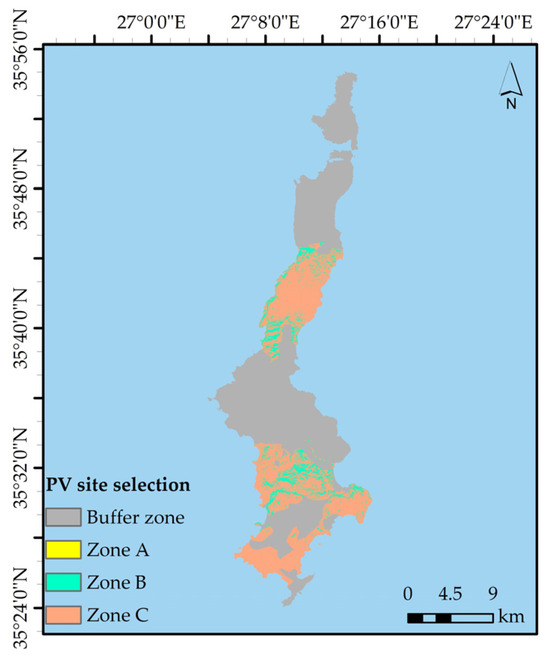 Figure 9 shows the final PV location map where four zones appear. The first zone is the buffer zone, where, according to the legislation and data processing, any installation of a photovoltaic module is prohibited. The remaining three zones have been delimited according to the final value of FS, which takes values from 0 to 1. In zone A, there are the locations where FS takes values up to 0.3; in zone B, the FS values are up to 0.5; and in the last zone C, the FS values reach the maximum value, which for the specific study scenario is 0.74. The area of the exclusion zone was calculated to be approximately 195.3 km2, while zones A, B, and C are 0.0 km2, 20.0 km2, and 106.1 km2, respectively.