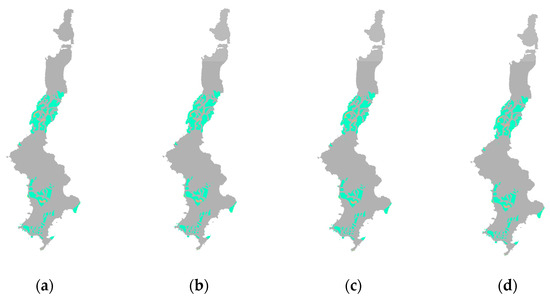 Sensitivity analysis for the PV site selection for changes in the weight of the solar potential: (a) −20%, (b) −10%, (c) +10%, and (d) +20%.