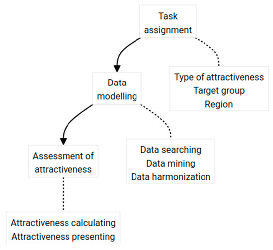 From the perspective of using OSM as a base of input data for attractiveness assessment, the Data modeling section is important, as it deals with the collection and processing of data suitable for site assessment. The following operations are required in processing OSM data:
